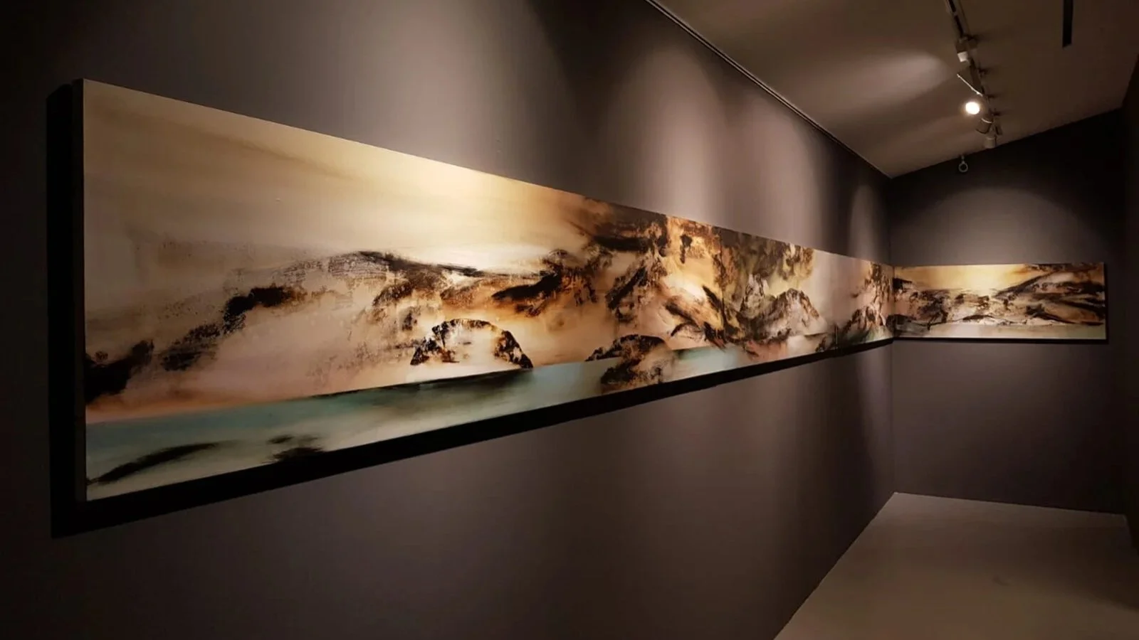 The (In)visible Horizons scroll series comprises horizontal paintings of 10 panels in varying lengths but consistent height, referencing traditional Chinese scrolls. Installed in a continuous line along a narrow corridor and around the gallery walls, the works unfold gradually—never visible in their entirety all at once. Like classical scrolls, they invite a slow, intimate encounter; the viewer must move along the corridor to view the panorama piece by piece, making the act of looking a personal journey.