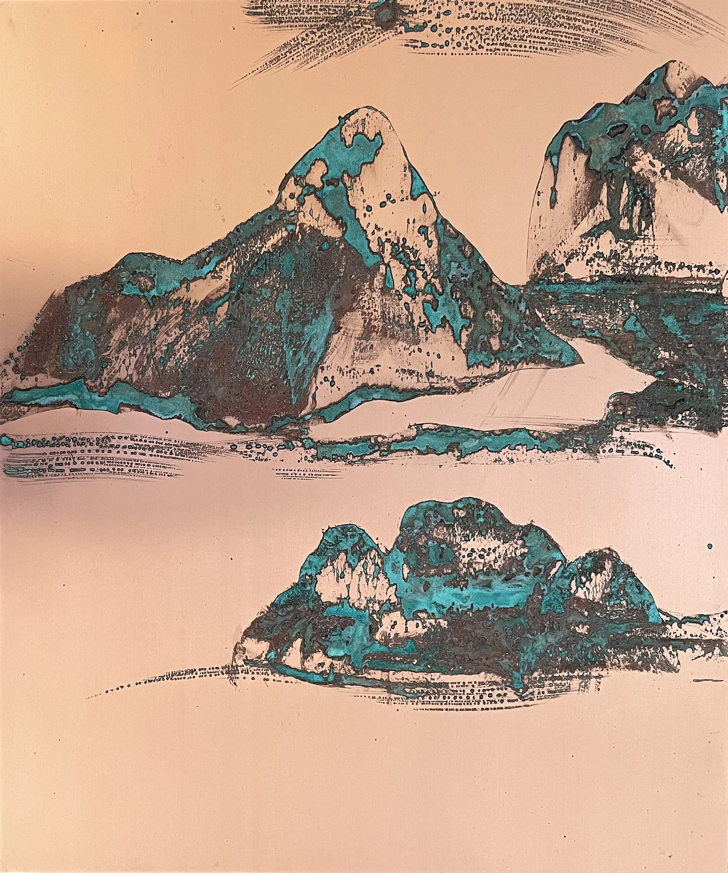 In Particulate, the artist harnesses rust as a barometer of time. She ‘paints’ scenes of shanshui via alchemical reactions between the air and oxidising solutions applied to copper sheets. Both serendipity and artistic intervention steer the works, allowing for the invisible energy of metal, moisture in the air, and time to react and become interwoven as means of ‘painting.’