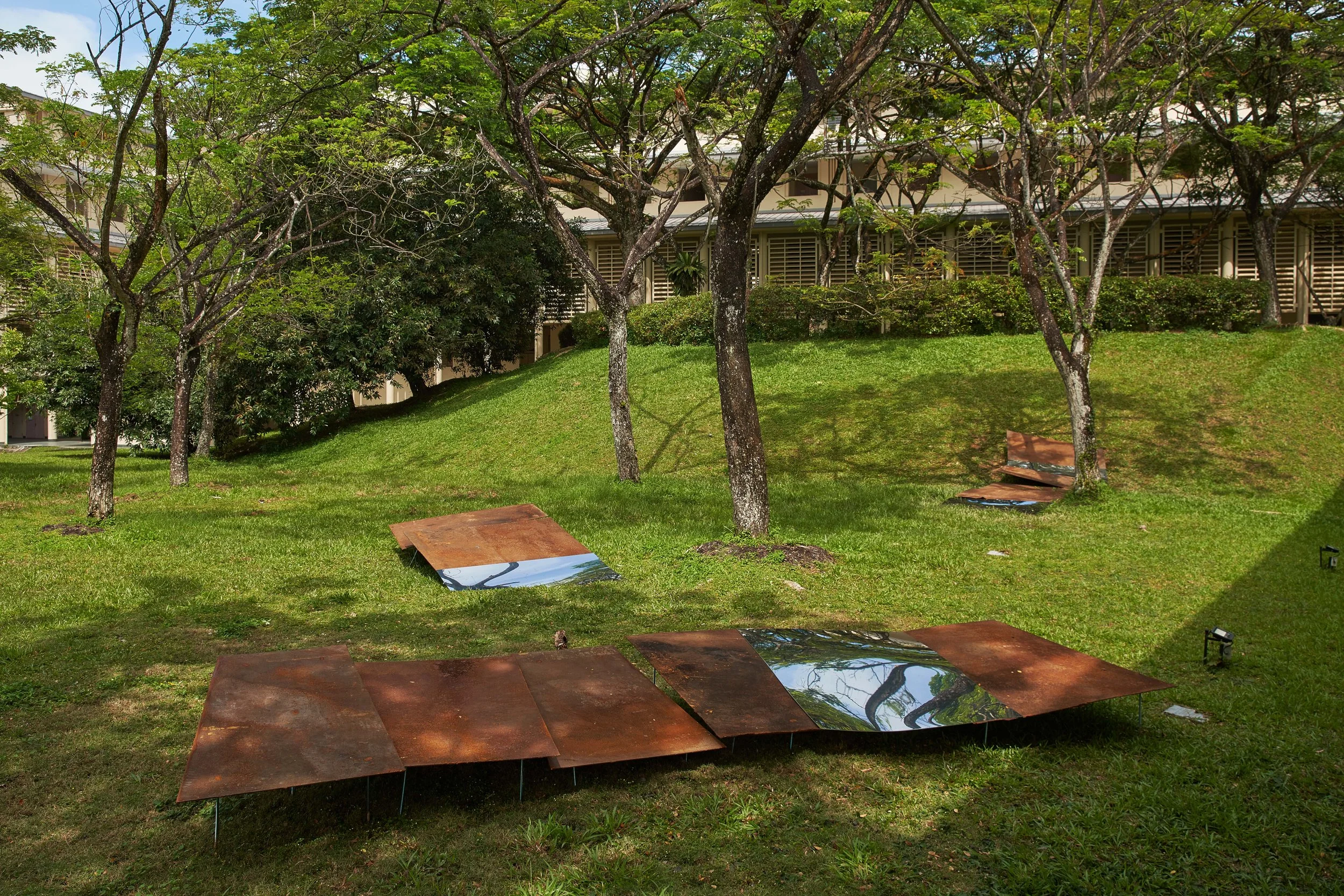 Salvaged Topographs (by Wyn-Lyn Tan and Zen Teh), reused mild steel and stainless steel sheets, exhibition view, Peripheral Spaces, NIE gallery, Singapore, 2022