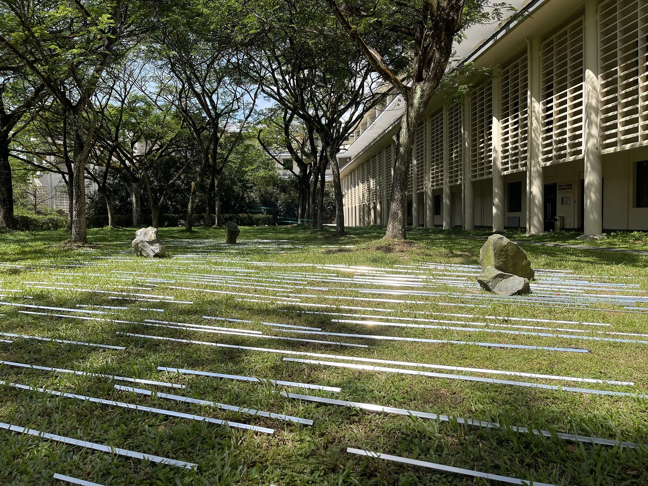 At the Interstices (by Wyn-Lyn Tan and Zen Teh), found rocks and aluminum bars, exhibition view, Peripheral Spaces, NIE gallery, Singapore, 2022