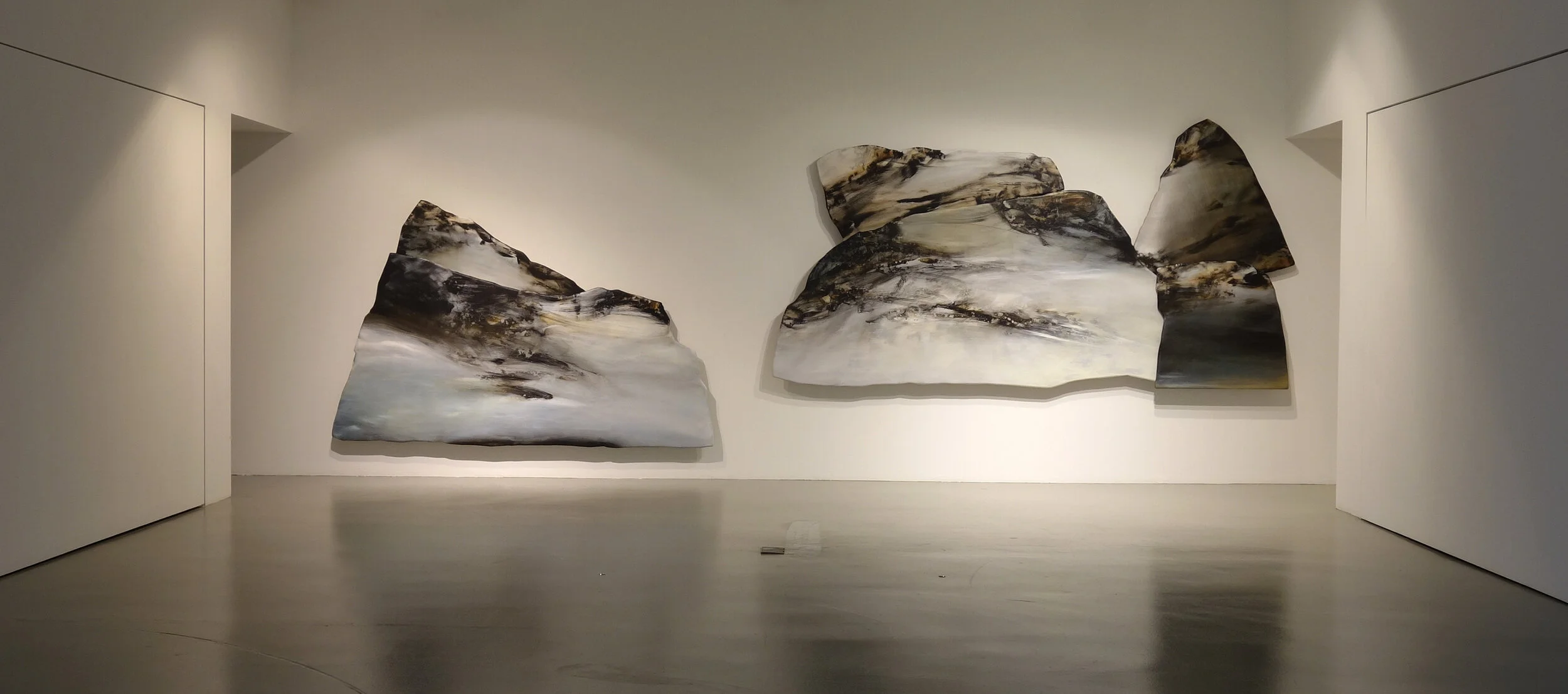 Curvilinear wood pieces, over which the artist has painted, are composed and mounted on the wall as one immersive landscape. Each of these wood pieces takes an organic form, reminiscent of ‘mountains.’ In Chinese landscape painting, the emptiness left vacant on the paper is as much a vital part of the composition. Here, the wall takes the place of the “white of the paper,” playing a key compositional role in engaging how the painted forms speak to one another. The supporting wall has thus been recast into an active backdrop, playing with space and a heightened sense of immersion. Emptiness and form are no longer separate qualities or states, but are structurally correlated: each exists only by virtue of the other.