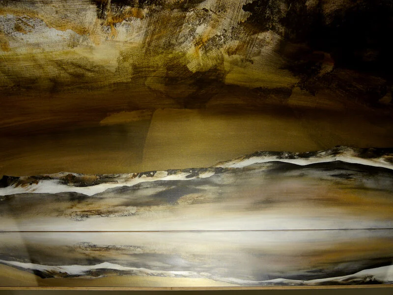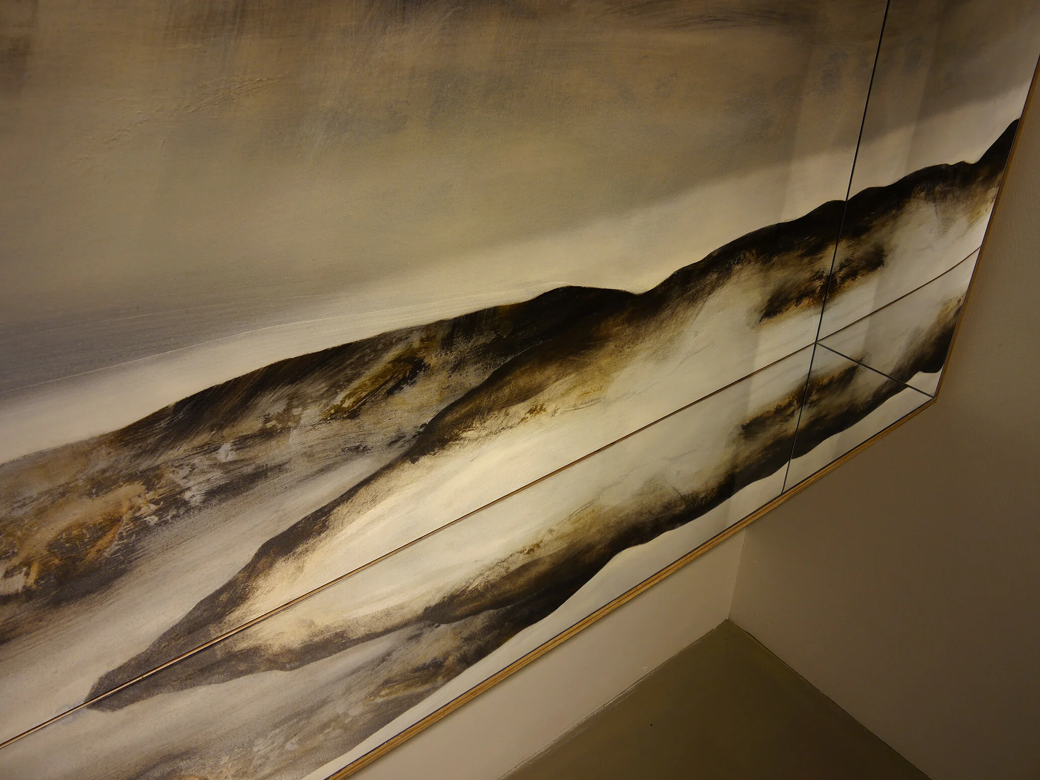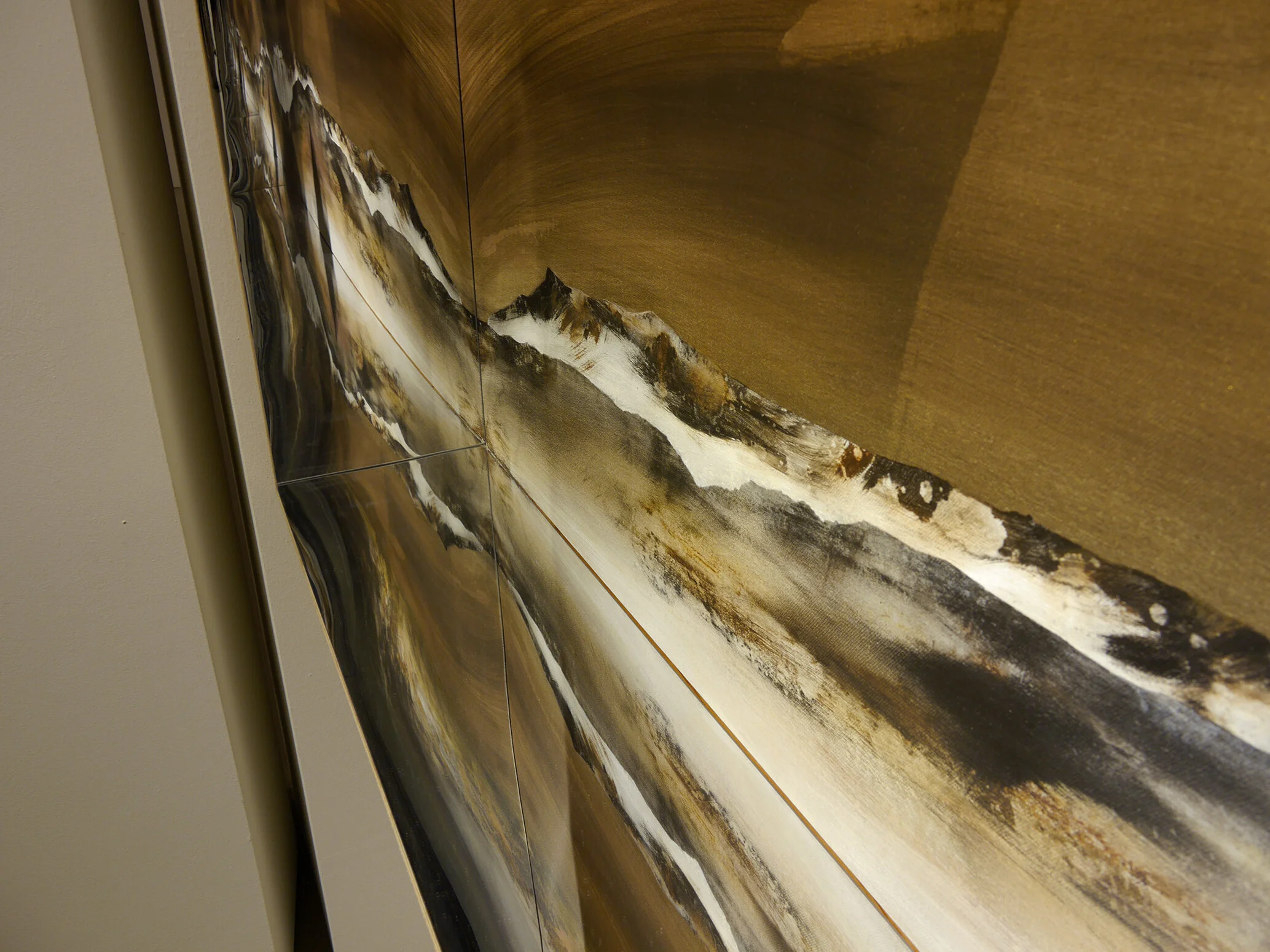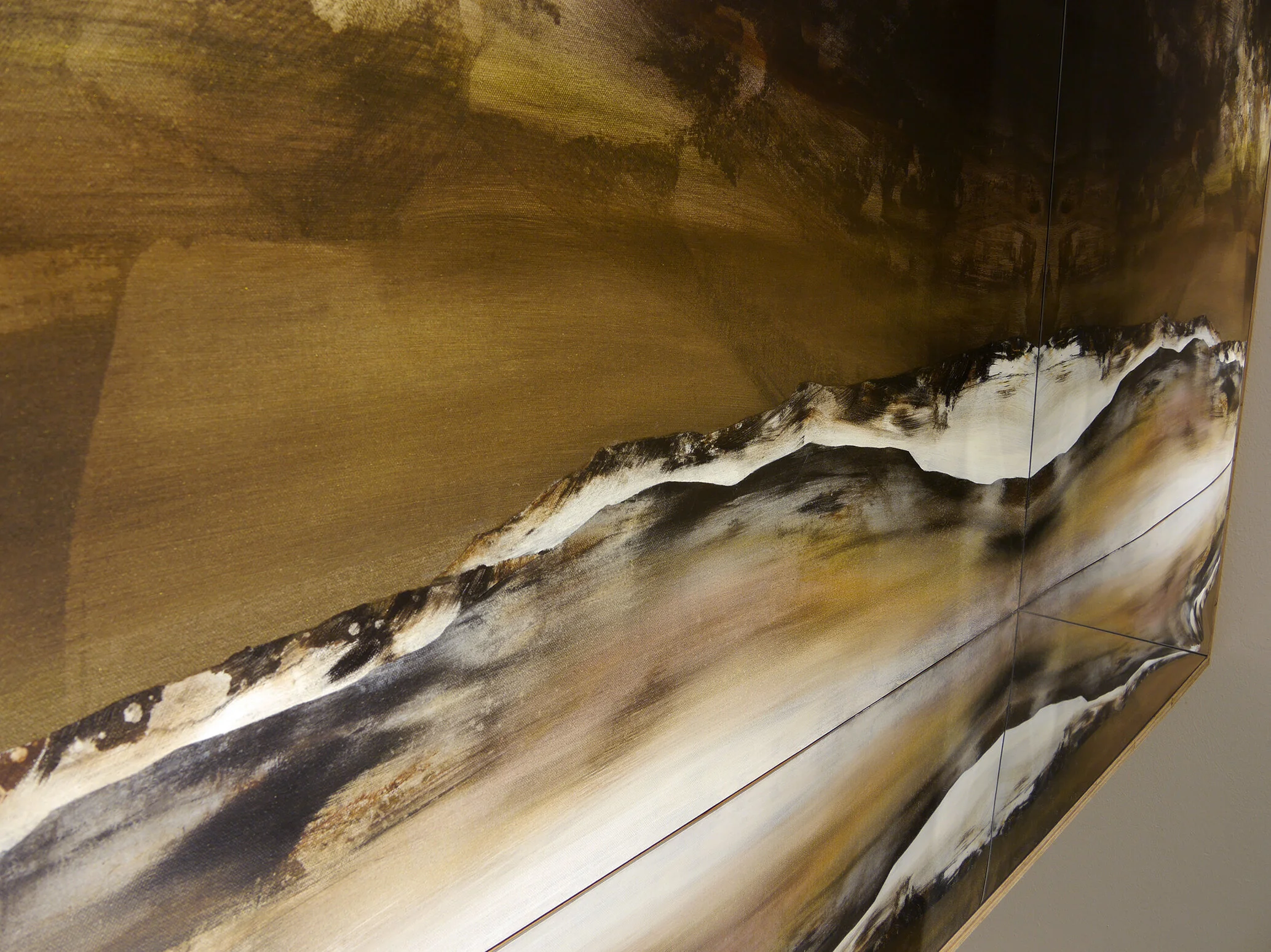 In the Vista series, each painting is encased in a deep box-like frame lined with mirrors on the inside rim. The reflections extend the image laterally and top, forward and outward, in a holographic way, opening up the illusion of another space beyond. Sized to seamlessly fit the width of the corridor, each painting appear as ‘windows’ or portals into another dimension.