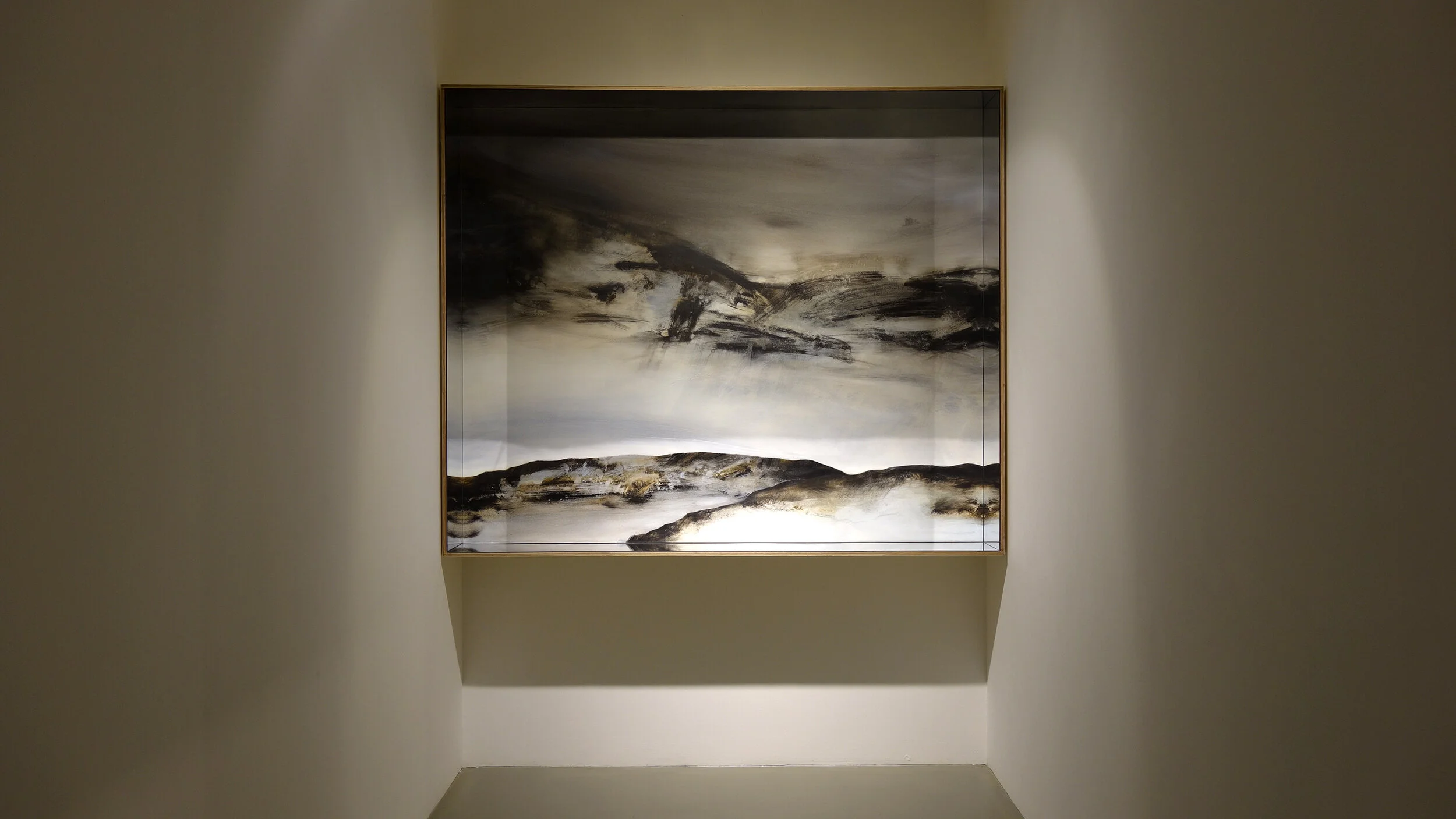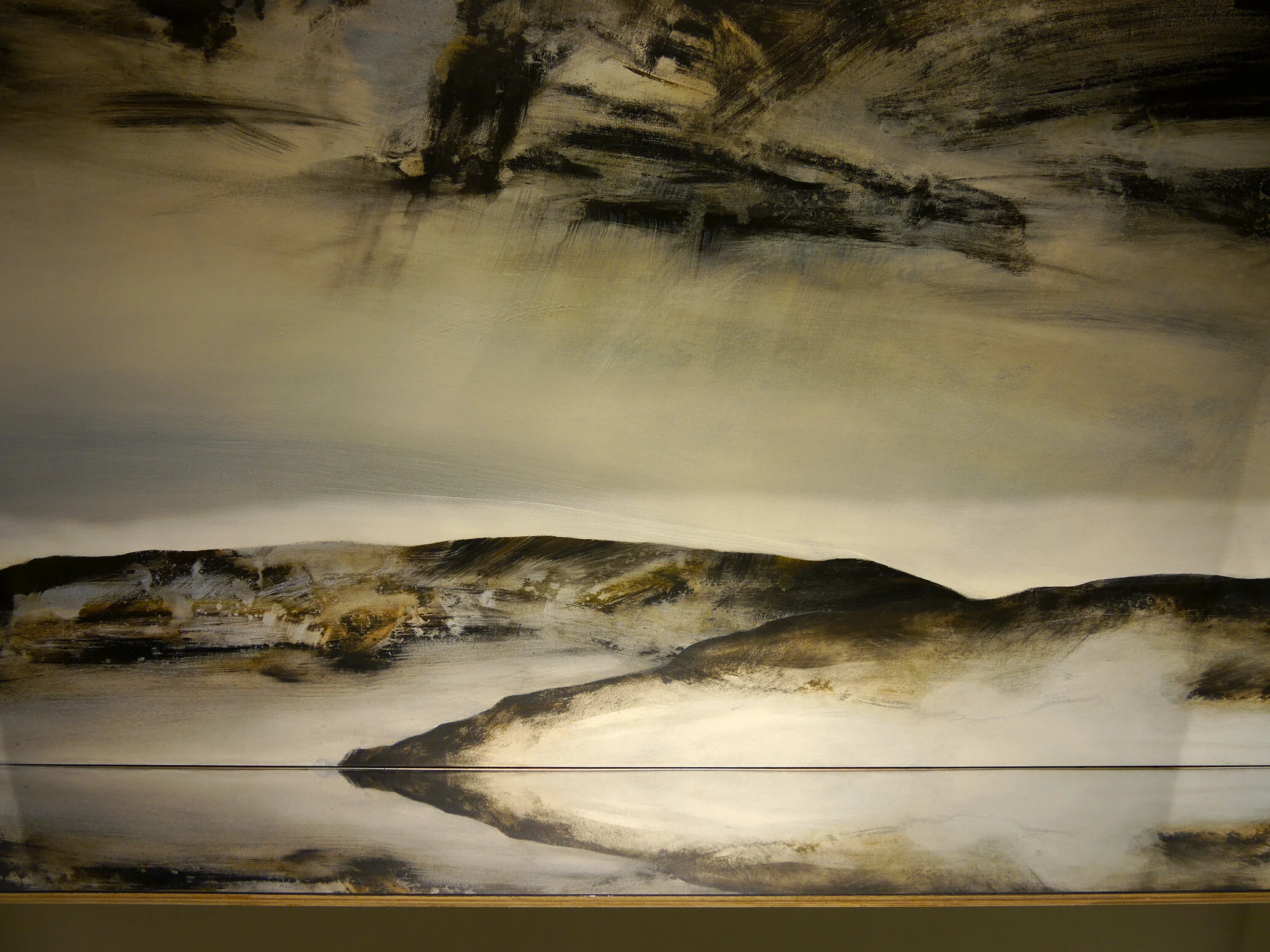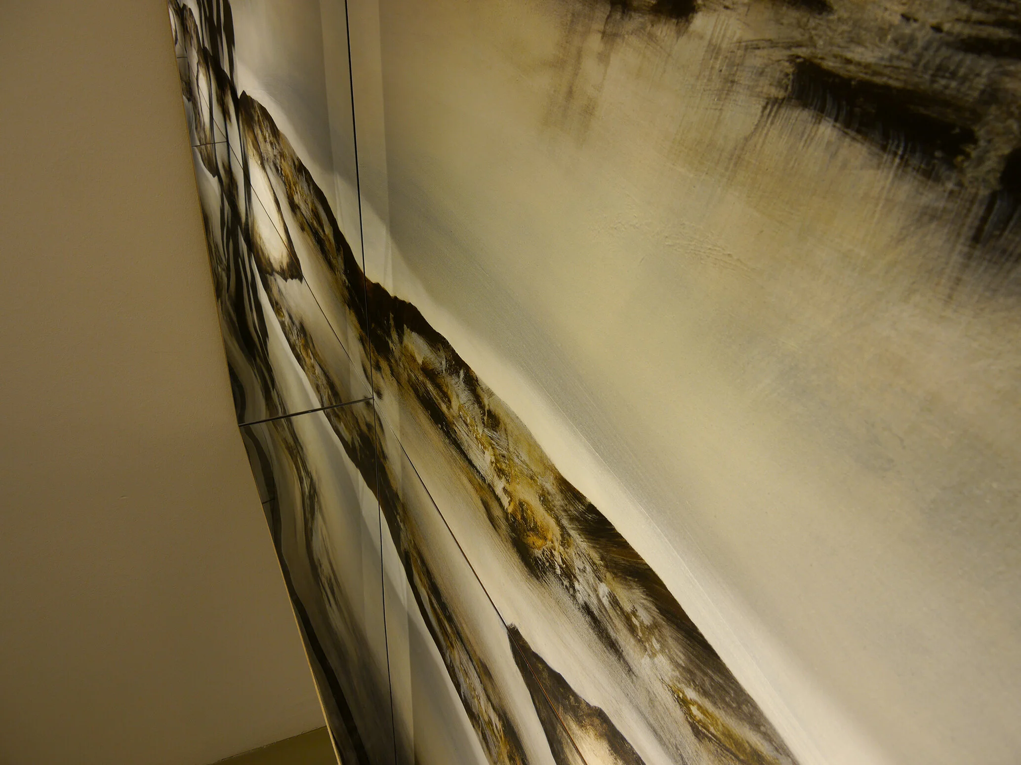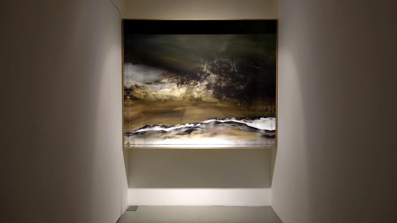 In the Vista series, each painting is encased in a deep box-like frame lined with mirrors on the inside rim. The reflections extend the image laterally and top, forward and outward, in a holographic way, opening up the illusion of another space beyond. Sized to seamlessly fit the width of the corridor, each painting appear as ‘windows’ or portals into another dimension.